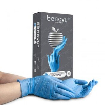 Перчатки медицинские диагностические (смотровые) одноразовые нестерильные "BENOVY" нитриловые неопудренные текстурированные на пальцах голубого цвета. Перчатки текстурированы на пальцах, что обеспечивает надежный захват инструмента. Гипоаллергенные из-за отсутствия протеинов натурального латекса. Неопудренные для снижения риска контактного дерматита. Форма перчатки - плоская, без разделения на правую и левую руку. Манжета закатана в венчик. Валик скручен вовнутрь, что препятствует скатыванию перчатки.