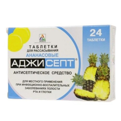 Аджисепт® , таблетки для рассасывания [апельсиновые]. Оранжевые круглые двояковыпуклые таблетки с преобладающим запахом апельсина, допускается неоднородность окрашивания, наличие незначительных пузырьков воздуха в карамельной массе и незначительные неровности краев. Аджисепт® , таблетки для рассасывания [лимонные]. Темно-желтые круглые двояковыпуклые таблетки с преобладающим запахом лимона; допускается неоднородность окрашивания, наличие незначительных пузырьков воздуха в карамельной массе и незначительные неровности краев. Аджисепт® , таблетки для рассасывания [ананасовые]. Желтые круглые двояковыпуклые таблетки с преобладающим запахом ананаса; допускается неоднородность окрашивания, наличие незначительных пузырьков воздуха в карамельной массе и незначительные неровности краев.