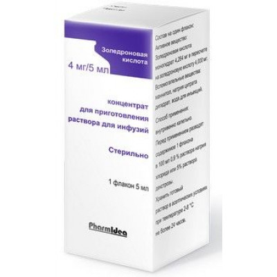 Метастазы в кости при злокачественных солидных опухолях и множественной миеломе: Взрослые и пациенты пожилого возраста: Рекомендуемая доза составляет 4 мг внутривенно капельно, в течение не менее 15 мин каждые 3-4 недели. Перед введением препарата разводят концентрат (содержимое 1 флакона) 100 мл раствора для инфузий, не содержащего кальций (0,9 % раствор натрия хлорида или 5 % раствора декстрозы). Пациентам также следует дополнительно назначать кальций внутрь в дозе 500 мг в сутки и витамин D внутрь в дозе 400 МЕ в сутки. Гиперкальциемия, обусловленная злокачественными опухолями: Взрослые и пациенты пожилого возраста: При гиперкальциемии (концентрация скорректированного по альбумину сывороточного кальция > 12 мг/дл или 3 ммоль/л) рекомендуемая однократно вводимая доза препарата составляет 4 мг. Для обеспечения адекватности гидратации пациента рекомендуется введение физиологического раствора перед, одновременно или после инфузии золедроновой кислоты. Пациенты с нарушением функции почек: Гиперкальциемия, обусловленная злокачественными опухолями: Решение о лечении золедроновой кислотой пациентов с выраженными нарушениями функции почек следует принимать только после тщательной оценки риска применения препарата и ожидаемой пользы терапии. Пациентам, у которых концентрация креатинина в сыворотки крови составляет 1,4 мг/дл) – повышение концентрации креатинина на 1 мг/дл. Терапию золедроновой кислотой возобновляют только после того, как уровень креатинина достигает значений в пределах +- 10 % от исходной величины, в той же дозе, которая применялась до прерывания лечения. Приготовление раствора для инфузий: Из концентрата 4 мг/5 мл (содержимое 1 флакона) готовят раствор для инфузий в асептических условиях. Перед введением препарата разводят концентрат (содержимое 1 флакона или меньший объем, если требуется) 100 мл раствора для инфузий, не содержащего кальций (0,9 % раствор натрия хлорида или 5 % раствор декстрозы). Приготовленный раствор золедроновой кислоты желательно использовать непосредственно после приготовления. Неиспользованный сразу раствор можно хранить в асептических условиях в холодильнике при температуре +2-8 ?С не более 24 часов. Перед введением раствор следует выдержать в помещении до достижения им комнатной температуры. Общее время между разведением концентрата, хранением приготовленного раствора в асептических условиях в холодильнике при температуре +2-8 ?С и окончанием введения препарата не должно превышать 24 часа. Раствор золедроновой кислоты не следует смешивать с любыми другими лекарственными препаратами. Препарат не следует смешивать с какими-либо растворами, содержащими кальций и любые другие двухвалентные катионы, такими как раствор Рингера. Для введения раствора золедроновой кислоты всегда следует использовать отдельную систему для инфузий.